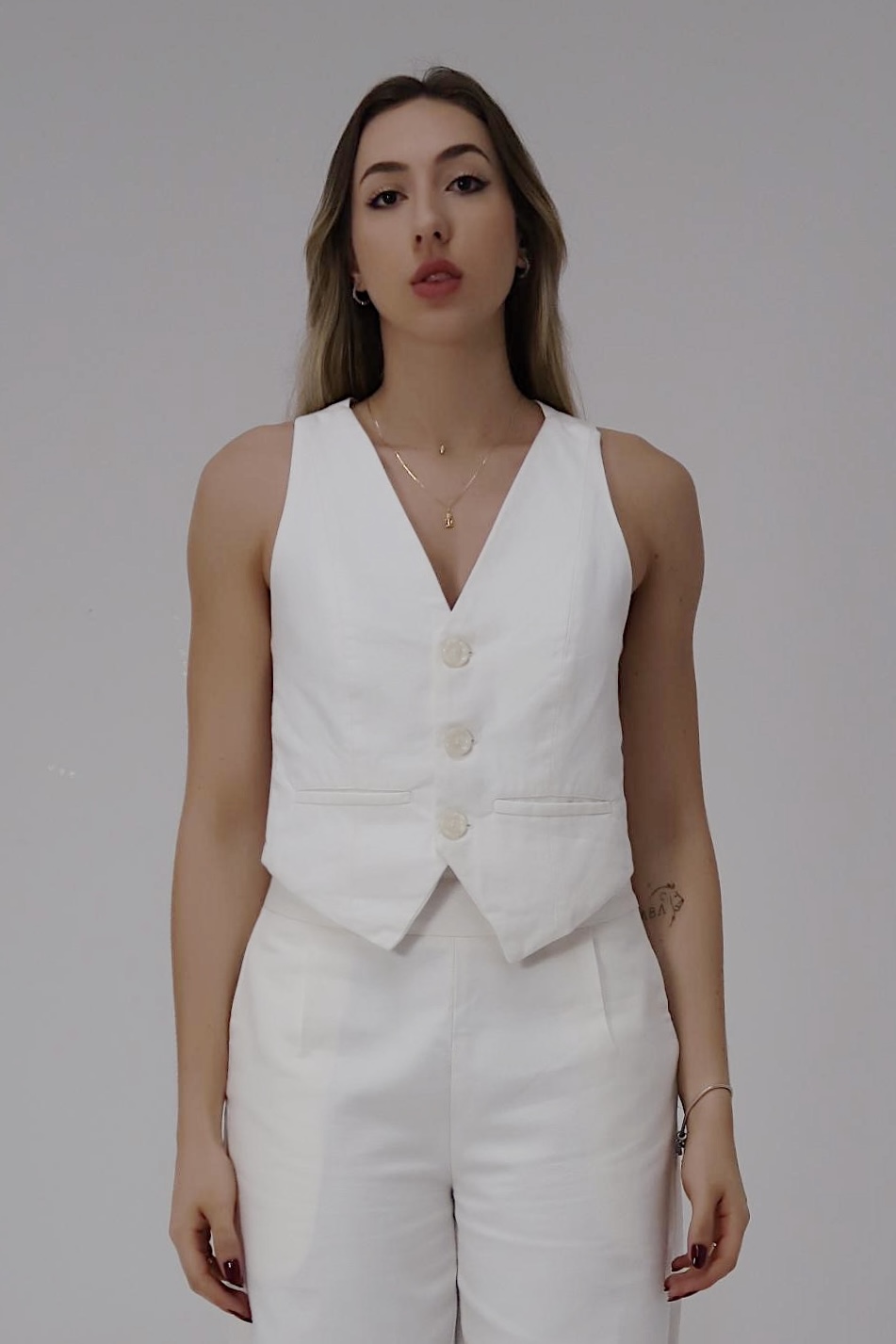 Nosso Colete Capri foi desenvolvido com uma modelagem moderna e sofisticada. Feito em tecido polinésia off white, que possui linho, modal e algodão em sua composição, trazendo um caimento elegante e estruturado. Além de ser um tecido mais grosso, o colete é feito com forro, para trazer ainda mais conforto para a peça. Possui dois bolsos frontais, e fachamento por três botões marmorizados off white. O destaque dessa peça está nas costas, o tecido cruzado deixando um lindo decote e valorizando a cintura. O colete perfeito para você arrasar no verão!!